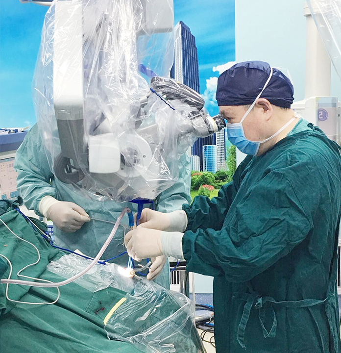 待准备就绪后,1月3日上午, 郑钰玲被送进了手术室。麻醉顺利后,李士其教授采用经蝶窦微创手术方式,在显微镜下,从右侧鼻腔入路,在窥镜下找到蝶窦开口... 分块吸除淡黄色的肿瘤组织,切除完毕后,止血复位。 整个手术不到一小时就完成,术中仅出血10毫升。术后患者被医护人员唤醒,安全送入ICU(重症监护室)病房。