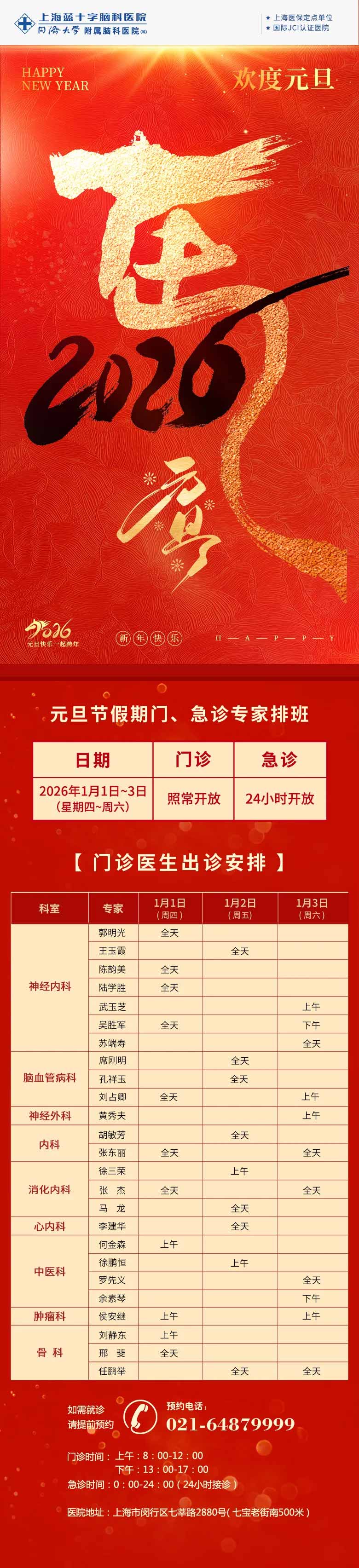 为更好地满足患者的就诊需求,根据国务院办公厅关于2026年元旦放假安排的通知,结合医院实际情况,2026年1月1日-3日元旦假期期间,我院门、急诊照常开放。门急诊安排详情如下: