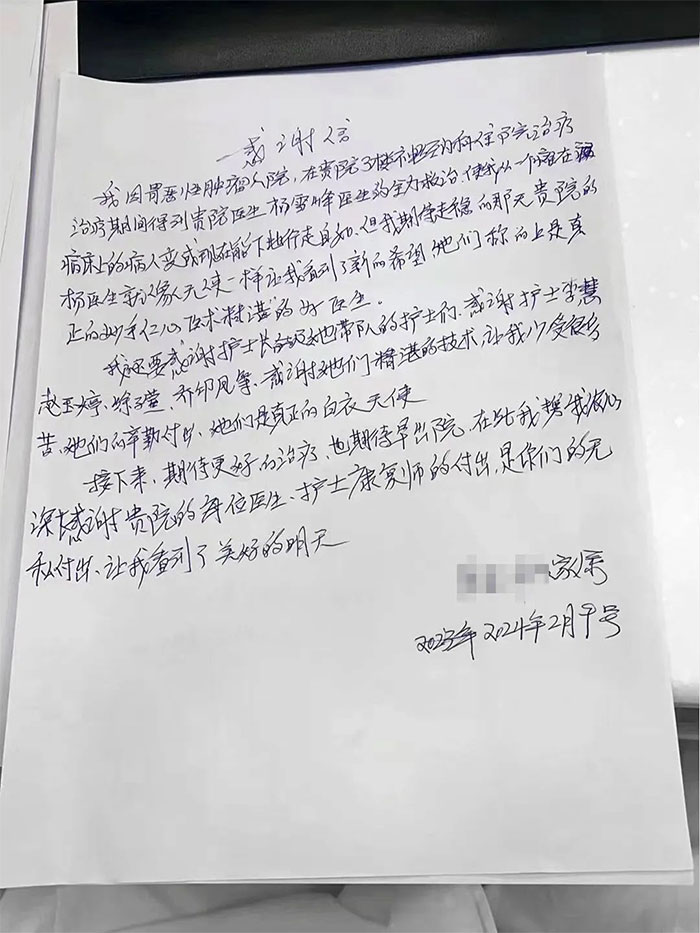 此外,还有更多医护“轻易/轻伤不下火线,始终坚守岗位”,如7B马娜等医生连续值班,下夜班后也依旧在岗;因兄长新年,殷昌凤主任匆忙返回老家后,初四便返岗;护士谢童童、董梓一等高烧,毅然坚持在岗;护士崔慧慧夜班后仍坚持在岗。以及5B病区雷蕾医生、黄秀娟医生、左宗耀医生等以敬业、奉献等获得好评。大年三十,雷蕾医生因精心治疗和敬业精神,收到患者3000元红包,婉拒无果后,将“红包”充进患者住院账户。左宗耀医生初四返岗,因耐心负责,和护士刘文一同收到患者感谢信。