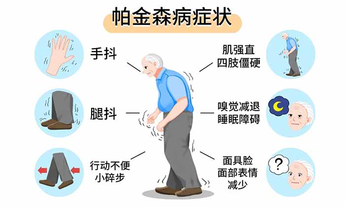 运动症状:静止性震颤(手抖)、运动迟缓(如系扣、穿衣困难)、肢体僵硬、姿势步态异常(如小碎步、易跌倒)、面部表情减少(“面具脸”)等。