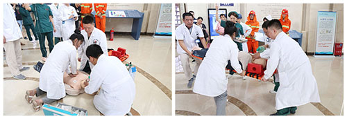 第一支灭火力量——微型消防站队员接到命令后三分钟抵达现场,第一时间解救被困人员。总指挥再次发出“门诊大厅发生蓝色事件”命令,医护组迅速赶来对患者实施心肺复苏抢救,等待救援。