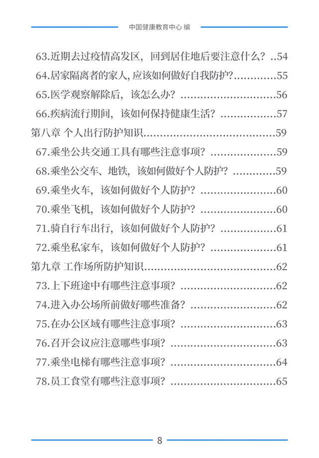 该手册共分为十五章,涉及相关知识、个人防护、重点人群防护、居家防护和消毒、出行防护、重点场所防护、就医防护、心理防护及健康生活方式等方面的114个问题,供广大公众和各级专业机构参考使用。