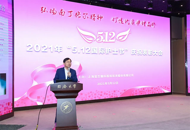 他表示,护理工作是一项崇高伟大的事业,既是一门内涵丰富的科学,更是一门精致温馨的艺术。广大护理工作者奋发进取、任劳任怨、默默坚守、从严自律,以高尚的医德医风和无私的奉献精神,树立起了白衣天使的光辉形象,为公司内涵质量建设和品牌发展作出重要贡献。他指出,在广大护理工作者共同努力下,公司护理学科带头人素质过硬,护士长队伍勇于担当,护理服务体系健全完善,护士激励机制日益完备,护理教学科研成绩明显,形成了蓝生特色和优势。近一年来,公司护理学科规范管理进一步加强,培养培训进一步提升,创先争优进一步深化,特色打造进一步拓展,社会责任进一步担当,充分体现了蓝生护理工作者迎难而上、并肩战斗的勇气和责任担当、追求卓越的精神。他强调,公司“十四五”规划为我们指明了发展方向和奋斗目标,也为护理工作提出了新的课题和挑战。护理工作者必须认清新形势,把握新要求,迎接新挑战,担当新作为,实现新突破。他要求,要加大优秀拔尖人才招聘引进力度,大力加强护士长队伍能力建设,持续深化优质服务活动,培植脑科护理特色优势,弘扬蓝生护理特色文化,致力将护理学科建设成为公司的核心竞争优势,成为全国社会办医护理学科的优秀标杆。