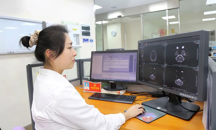 每天拍片、读片、写诊断报告,看似轻松的工作,其实不然。每天坐在PACS屏幕前和黑白图像打交道,一名患者就有上百张图像,每一张图像江楠楠都需要扫过,通过反复查看、对比,用自己专业的知识和敏锐的观察、分析,从这些图像的蛛丝马迹中,准确地找到疾病根源。每天一坐阅片就是6、7个小时,高峰期时,为确保尽早出报告,江楠楠更是顾不上喝水、上厕所。