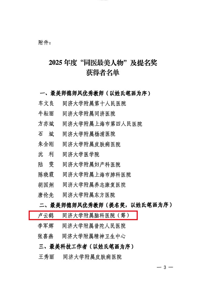近日,中共同济大学医学院委员会开展的2025年度“同医最美人物”评选揭晓。经同济大学医学院党委组织评选与决议,在各院系、中心及附属医院中产生“最美师德师风优秀教师”10名、提名奖3名,“最美科技工作者”10名、提名奖4名,“最美医务工作者”10名、提名奖4名,“最美管理工作者”10名、提名奖4名。