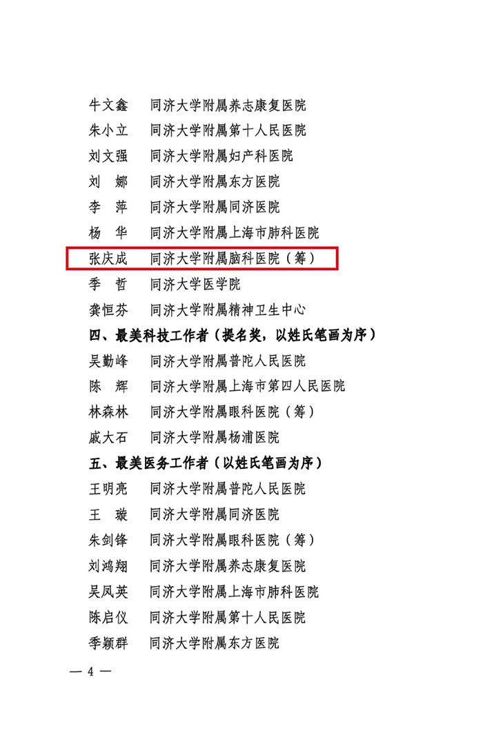 上海蓝十字脑科医院【同济大学附属蓝十字脑科医院(筹)】卢云鹤、张庆成、王贵平、吴春芳4人喜获荣誉称号!